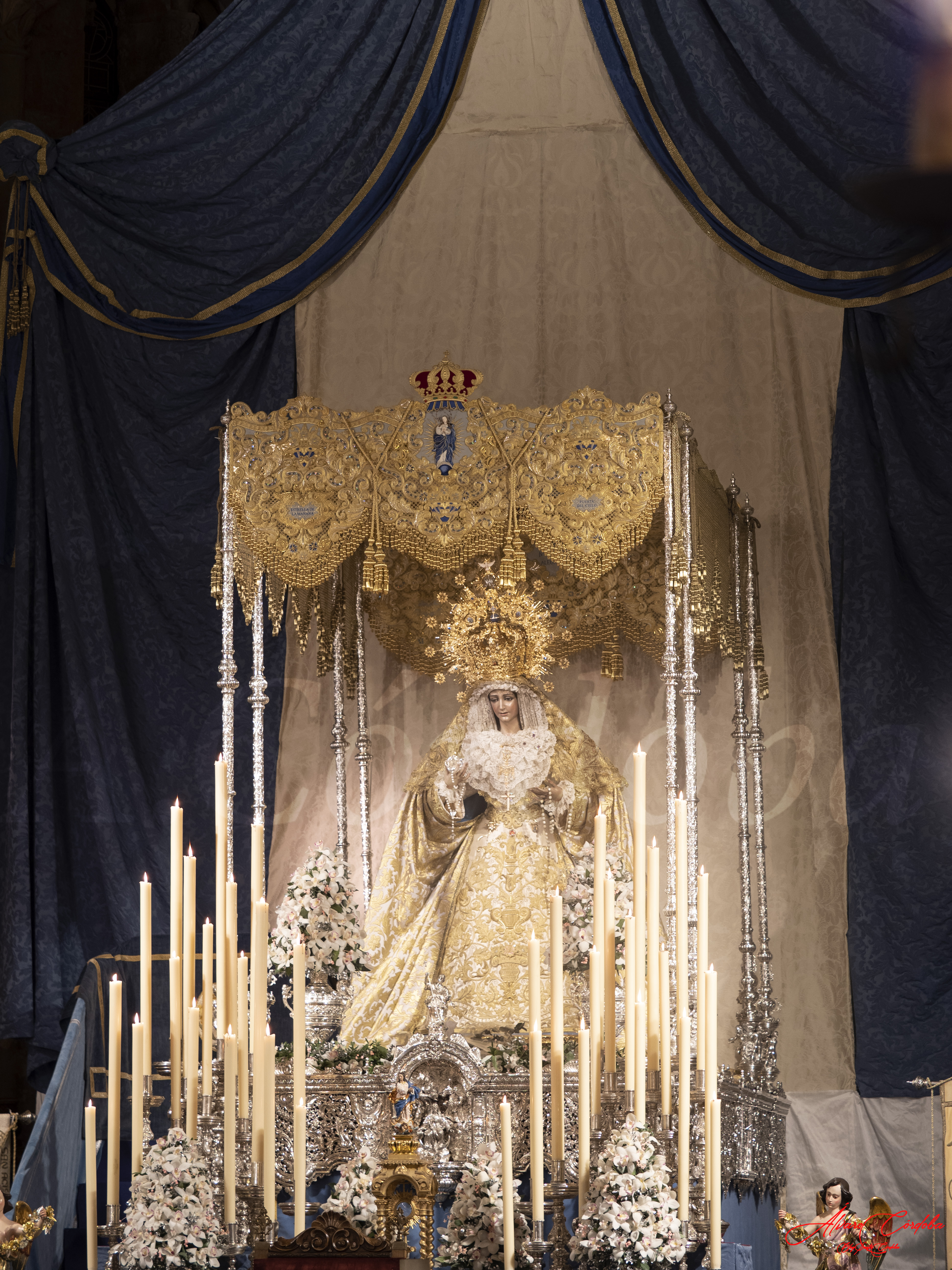 La Hermandad del Resucitado celebró del 5 al 7 de diciembre el solemne triduo en honor de María Santísima Reina de Nuestra Alegría en la Parroquia de Santa Marina y Aguas Santas. La dolorosa que gubiara Juan Martínez Cerrillo lució la nueva corona bendecida e impuesta el día 3 de diciembre siendo realizada y diseñada por José Manuel Bernet en plata sobredorada.