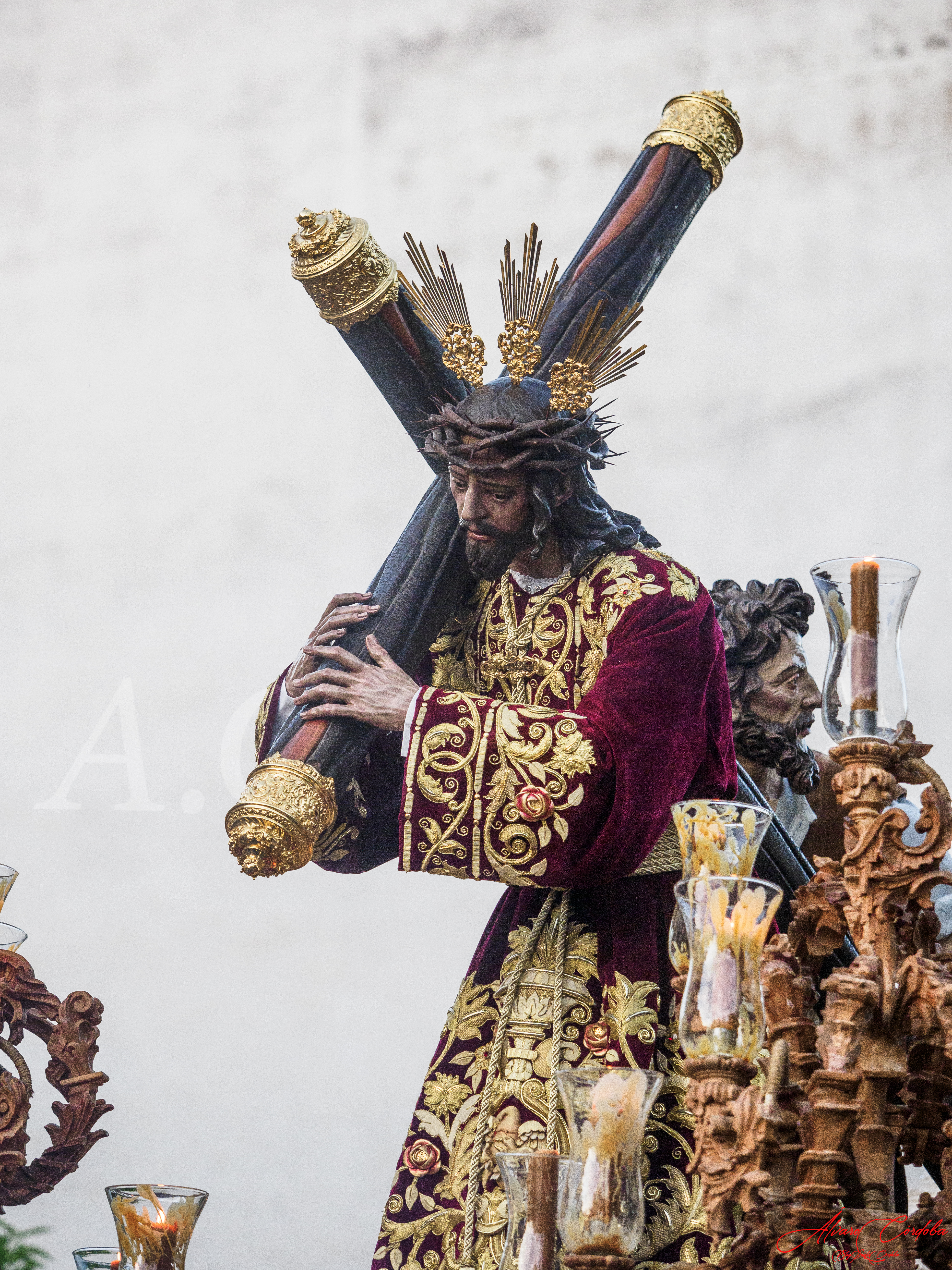 Desde la Parroquia de San Andrés Apóstol con cubrerrostros y túnica roja llega la Hermandad de Penitencia y Cofradía de Nazarenos de Nuestro Padre Jesús del Buen Suceso en su encuentro con su Santísima Madre la Virgen de los Dolores en la calle de la Amargura, María Santísima de la Caridad y San Andrés Apóstol.