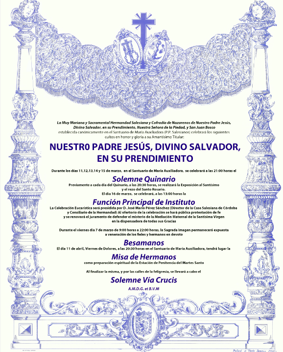 Comenzando por la Exposición de S.D.M., Ejercicio del Quinario y Reserva. Seguidamente, Santa Misa con homilía a cargo del